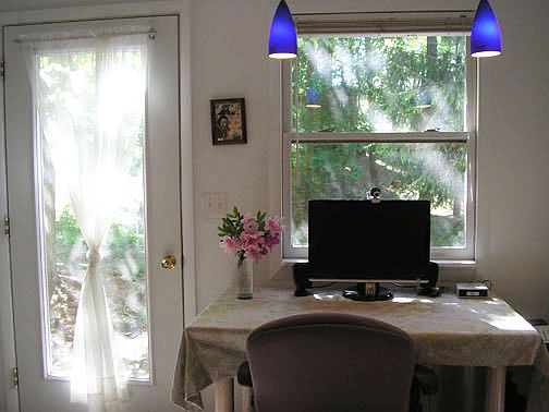Beautiful natural light downstairs apt in duplex, unfurnished or furnished. Stained concrete floors, tile in kitchenette, washer and drier, well water, stained glass window. Granite counter tops in kitchenette with full sized fridge and large pantry. All window drapes and blinds included. Private porch with outdoor table, chairs, ceiling fan, off street parking. Includes a hepa, double charcoal filtered air system and ceiling fans through out. Apt is in a neighborhood that is good for walking on a private road. The house is on a mostly wooded lot with organic gardens in a very quiet area. Apartment is cozy and private. Five minutes to downtown Weaverville. 750 square feet, all utilities included except wi-fi, well water and electricity. Yard maintenance is included in rent. Currently furnished, but available unfurnished as well. Pets allowed with pet deposit. Strictly no smoking. 1350/month with year lease or 1600/month to month, 1 month minimum. References and credit check. Available now. Renter is responsible for half of internet (already on, and shared with upstairs apt) and half of electricity. House is extremely well insulated, so bills are very reasonable. Downstairs is buried half way into a hill, so this also helps with insulation. Ceiling fans throughout as well. Water is on a well, and is 25/month. Landlord pays for trash pick up, recycling. One year lease, though short term is available for increased fee. One month minimum.
