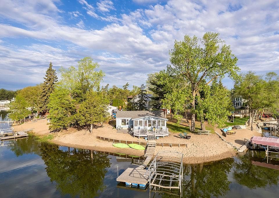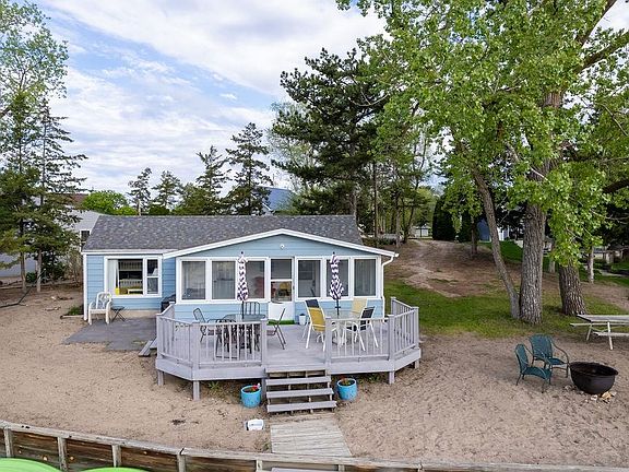 JUST IN TIME FOR SOME SUMMER FUN! THIS 3 SEASON CABIN COMES FURNISHED AND SITS ON THE POINT OF THE PENINSULA SURROUNDED BY WATER ON 3 SIDES! THE CABIN HAS A SAND POINT-WELL FOR WATERING BUT THE CABIN PLUMBING HAS BEEN UPGRADED TO CITY WATER. SALE INCLUDES SHORE STATION, DOCK, STORAGE SHED, TILLER, FURNITURE, & MORE! ADDITIONAL UPDATES INCLUDE BATHROOM FLOORING, NEW ELECTRICAL PANEL, & NEW WATER HEATER! NEW BASE LEASE LOT RENT TO BE $4900. PROPANE TANK IS OWNED.