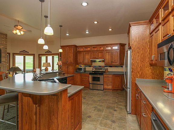 This lovely 6,291 square foot multi-level custom built home facing the mountains can be yours! The covered front porch with custom oak and stained glass double front doors will welcome you in to the open two story foyer which is highlighted by a beautiful curved stairway leading into a second story open sitting and game area, with an office and a half bath. The floor-to-ceiling stone fireplace in the living room is framed by large windows which focus on the beautiful Big Horn mountains. This home is filled with built-ins-3 custom gas fireplaces, 4 bedrooms (which includes 2 main floor master suites), 3 full bathrooms and 2 half baths. The finished lower level has a fireplace, a large great room and its own walk out/ entry to a covered patio. Large custom kitchen with Corian counters opens