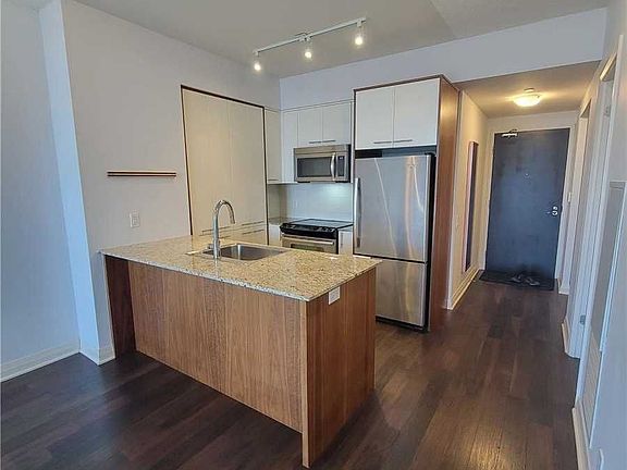 This Condo Is A Beautiful And Spacious 1 Br + Den, Located In The Heart Etobicoke. The Unit Has A Modern Kitchen With Ss Appliances, Granite Countertops & A Bkfst Bar. The Living Area Is Bright And Airy With Large Windows And A 76 Sq Ft Balcony. The Main Room Has Floor To Ceiling Windows And Has A Large W/I Closet. The Den Can Be Used As An Office And Is Large Enough To Be A 2nd Extra Br. The Unit Comes With One Parking Space And A Locker. Residents enjoy access to premium amenities including an indoor pool, sauna, yoga studio, fitness room, guest suite, movie theatre, outdoor BBQ area, 24-hour concierge, secure parking, and unbeatable location near Hwy427/QEW.