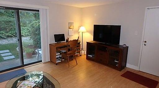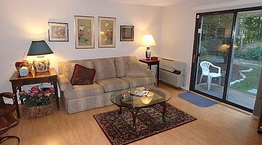 Showings start Saturday at OPEN HOUSE 08/15 12-2:00 Remarkable 1st floor unit facing the back with wonderful views of green, total privacy perfect for a pet, barbecuing or gardening ..One of the nicest units in the complex..Laminate flooring through out..gorgeous kitchen with beautiful cabinetry, granite counter tops,built in microwave, tiled back splash..updated appliances..Bathroom tastefully updated with newer vanity,bath and tiles. Large bedroom closet with organizer for maximum use .. Low condo fees.. Natick Village is walking distance to train, Pool,tennis,full size gym all included in condo fees..Pet friendly community..must see !!