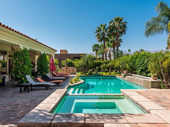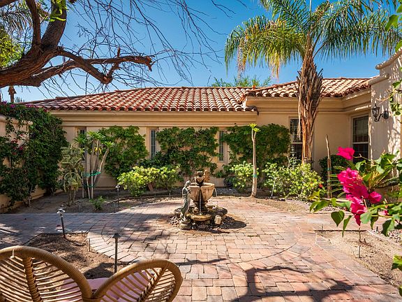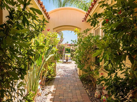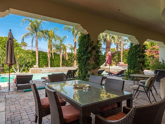 Extensive upgrades in this Luxurious European style Rancho Mirage mini estate with 4600 Square feet of living space, 4 bedrooms (one is a detached CASITA) 4.5 baths, plus a private office with custom built-ins, a large bonus room, and a 3 car garage. The expansive lot hosts a spectacular and large private pool & spa with water falls, a small sport court, and plenty of covered patio space along the full length of the home. The Panoramic mountain views allow for year round sunsets.The Gourmet kitchen has high end appliances, a center island and breakfast nook and is all open to the living area. The Grand living room has a wet bar, fireplace, built-in cabinets and a rotunda dining area with views to the back yard. The elegant master suite has a large sitting area, fireplace, large, walk-in shower, his and hers closets plus an additional, large walk in closet that will wow you!All of the other bedrooms are en- suite, including the Casita off of the courtyard, and have high ceilings and plantation shutters. Travertine floors and luxurious hardwood floors throughout. This exclusive Gated community of Villaggio on Sinatra is very close to Eisenhower hospital, shops restaurants and golf courses.