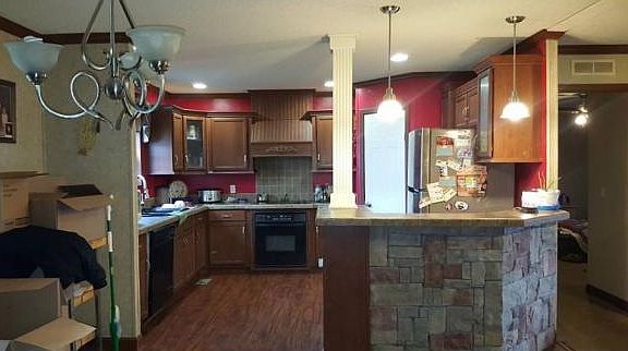 As you step into this updated manufactured home you'll see there is plenty of room for entertaining or a growing family. With an open concept you'll quickly notice the bar with great stone work and the fireplace in the living room. Just off the kitchen is a home office with built in cabinets and desk. In addition to the office there are two other bedrooms and a master bed and bath. The master bath is large with double sinks, garden tub, shower and its own linen closet. Home is on two city lots.