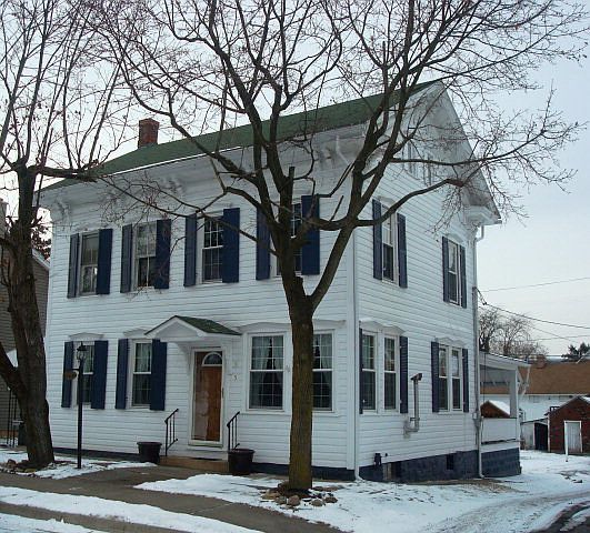 GREAT Location-close to park & post office. Several updates completed. Foyer, living room, dining room, bathrooms & 1 bedroom have, newer drywall, fresh paint & trim. Pellet stove offsets oil heat costs. Spacious eat-in size kitchen plus separate dining room w/newer laminate flooring. Most windows have been replaced. Detached 1 car garage. Full size bath on second floor has separate shower & jet tub. Walk up attic for ample storage space. Covered concrete patio off the kitchen for relaxing & easy grilling. Covered rear porch. Not in flood zone