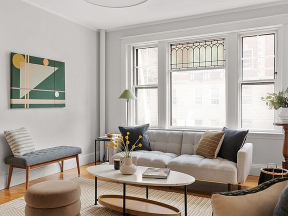 Sophisticated first-floor condo in the Avon Hill neighborhood, blocks to Porter & Harvard Sq and the many restaurants and shops along Mass Ave. Positioned on the corner, the unit allows for South and East exposure through oversized historical windows, offering a view of Cambridge’s Classic architecture and lush tree canopy. The living room boasts a decorative mantel with high ceilings, while the adjacent curved dining room includes south facing windows. The first bedroom is used as a small bedroom or home office. The primary bedroom includes a bay window and dueling closets. A breakfast nook in the classic all-white kitchen overlooks the rear common courtyard. Established, professionally managed condo association with high owner occupancy rate and private storage in the basement.
