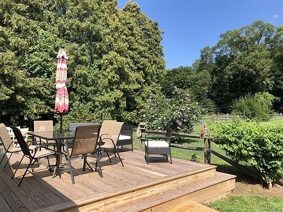 Absolutely gorgeous completely fenced in private back yard. Property backs up to Smiths Pond (Robin Hill) tree sanctuary with walking trails owned by Syracuse University. This 3 bedroom with cedar closets, 1.5 bath ranch has new kitchen and bath with walk in shower 2019. New stainless steel oven in 2019. New beautiful deck off the back, some new windows and all new carpeting in 2018. New radiant hot water gas furnace in 2017. Mitsubishi wall air conditioning new in 2015. 1st floor laundry, stove, dishwasher and refrigerator stay, attached garage with ramp and electric door opener, nice patio off the front, gas fireplace in living room, large windows off the back for awesome view of the beautiful back yard. Taxes do not reflect any tax discounts.