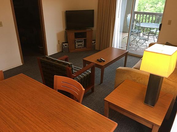 Winter lake view from 21 ft covered deck and year round beautiful secluded view of the hills and foliage. WALK to the pool, playsground and tennis court. Fully furnished and ready to be your second home or vacation rental investment! Kitchen and baths remodeled with new cabinets & counter tops PLUS a WALK-IN shower in guest bath. Newer HVAC. HOA fee includes cable! Closest condos to Silver Dollar City on Indian Pt. NEW roofs in 2017!