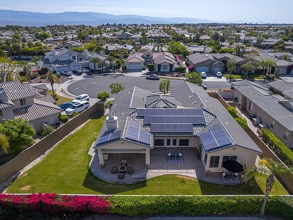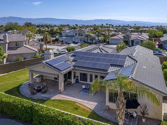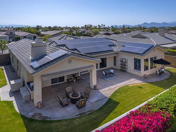 Nestled in the Victoria Falls community, this Duchess model home is a gem in the heart of Rancho Mirage. Featuring 4 beds, 4 baths, and a grand entrance into a spacious foyer with high ceilings and arched doorways that lead to a family room and a formal dining room with easy access to the patio. The second living room has a remodeled gas fireplace and sliding doors that open to the backyard. The chef's kitchen boasts granite countertops, a large center island, stainless steel appliances, a double oven, pull outs and lazy suzy, trash compactor and a walk-in pantry. Escape to the primary suite, a serene retreat with its large windows that let in plenty of natural light. The ensuite features a custom walk-in spa tub, walk-in shower, separate vanities, and a closet with built-ins. There is a second primary bedroom complete with sitting area, ensuite bath and a beautiful hand-stenciled cement accent wall. Throughout the home, you'll find lovely Hunter Douglas blinds and plantation shutters on all the windows. Outside is set up for relaxation and entertaining with censored awnings, misters, and a built-in grill. Enjoy the beautiful rose bushes, mountain views, and large side yard that has plenty of space for a pool. Plus, paid solar that helps reduce your energy bills. The community features multiple tennis courts and a low HOA. Located directly across from Gelson's and close to shopping and highway access. Schedule a tour today!