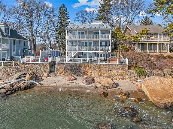 Spectacular waterfront estate offers unparalleled views of Long Island Sound & Duck Island, your own private sandy beach with 72' of frontage + a separate deeded 1.15 acre lot currently paved for additional parking. A much sought after property, on the market for the first time in 29 years! 61 Grove Way with its stately Victorian exterior aesthetic, is designed to maximize the experience of waterfront living on every level of the home. Spacious open-concept remodeled interior living spaces blend elegance with functionality. A state-of-the-art kitchen w/ heated floors, granite counters, gas range, high-end appliances, large island & sunny turret breakfast nook is a natural gathering place. Open Living/Dining Area w/ hardwood floors, floor-to-ceiling glass walls & large sliding doors allow sunlight to flood every corner while providing uninterrupted vistas of the shimmering water. Expansive covered decks extend from the house creating outdoor living spaces perfect for lounging, entertaining, or simply soaking in the serenity of the setting. Upper level offers 3 bedrooms designed as personal retreats. Master suite w/ glass sliders to water-facing balcony and bathroom w/ heated floor, stall shower & double sinks. Second bedroom also w/ glass sliders to share the covered deck. This level includes a 3rd bedroom, a cozy turret sitting room & front-facing covered deck. Ascend to the 3rd level for exquisite views of Long Island Sound from the rooftop terrace. Lower level is an entertainer's dream w/ Rec/Playroom, Full bath & laundry room + Event Kitchen offering storage galore. Lower level walks out to flagstone patio w/ outdoor kitchen, hot tub & al fresco dining areas, overlooking your private beach. Fabulous setting to be enjoyed year-round w/ space & a place for everyone! Professionally landscaped grounds with irrigation system. Swimming platform installed 2024 stored Marina incl. Member of Grove Beach Improvement Assoc. May be sold furnished