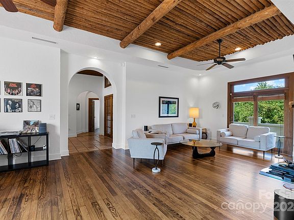 This Mediterranean beauty is a must see for those seeking year-round long-range mountain views and an ideal location: just 5mins to Weaverville Main St & 15min to downtown Asheville. The old world charm is enchanting: foyer is capped with barrel pine ceiling, arched doorways, solid wood doors, wood ceilings plus unique log ceiling in the living room and an elevated gas adobe fireplace. One level living, three full bedrooms, two bonus/flex rooms, great office and a huge primary bedroom suite. Home sits back from the road on a lovely flat knoll so it's very private on all sides with gorgeous landscaping. The back porch goes the length of the home overlooking the long range mountain views and pasture. Well-planned driveway loops around the front and back side permitting you to drive through the two-car attached garage with a separate carport too. Alpine Meadows is a highly sought North Buncombe neighborhood with its own private pond too. Sellers relocating. See list for improvements.