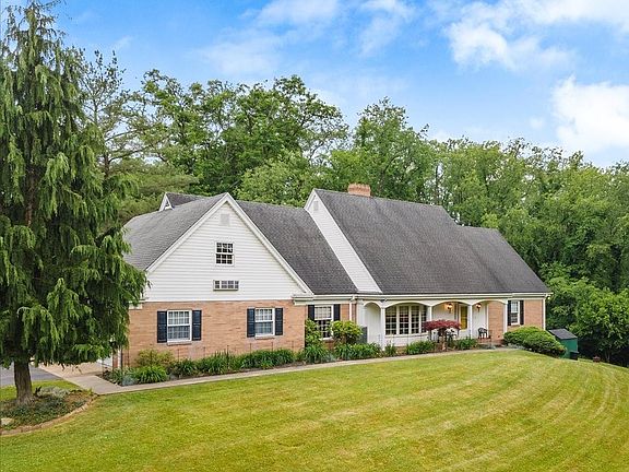 This is a extraordinary home in a idyllic 6.5Ac setting down a private lane offers PRIVACY w/public utilities! Owner's suite & den/sitting room on main level + 4 bedrooms on the upper level. Plus an additional 2 rooms on the upper level over the garage (set up as BR#s 6 & 7 currently)---are ideal offices for remote work or future apartment. The entry w/marble floor & curved staircase is impressive! The familyroom has beautiful built-ins w/ a sliding door to a awning covered patio overlooking the landscape. Huge kitchen w/ warm wood cabinetry. The formal living room is being used as a large dining room w/ fireplace for the owner's large family! A walk-out laundry in basement could be moved to upper mud room off kitchen w/ walk-out. The huge lower level has a 2nd kitchen, game room, full bath, exercise room w/a walk-out to a fenced dog run area. --could be a wonderful guest suite. Gas line at driveway (pole can been seen). Add'l Rm 13x13 on upper level. Plaster walls! Close to hospital.