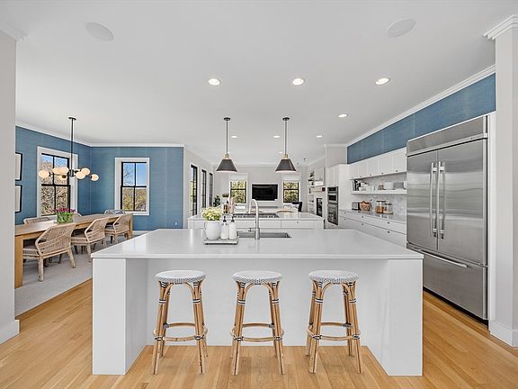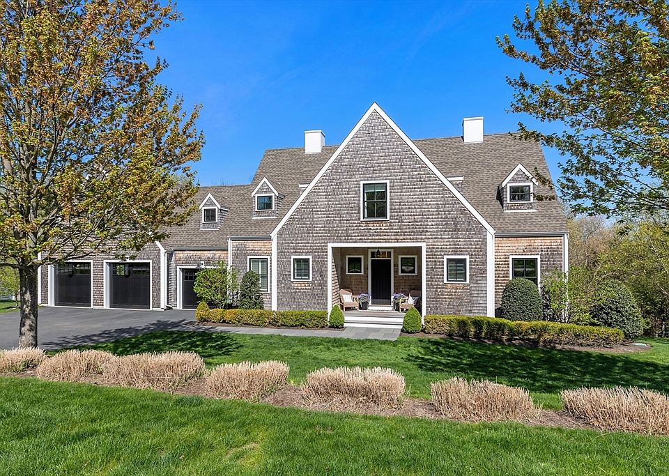 Gorgeous, Nantucket inspired cape w/4850 SF of living space "reimagined" w/a fabulous OPEN floor plan, high ceilings and floor to ceiling windows! Sited at the TOP of coveted Baker Hill, you will enjoy the beautiful open vista, abundant natural light, and living at the height of the soaring trees below you! Beautiful white kitchen w/high end cabinetry and appliances open to a light filled dining room, cozy living room and spacious family room w/fireplace. There's a home office tucked away from the activity of everyday life, a Mudroom w/cubbies and a walk in pantry w/beverage nook. Upstairs there are 4 bedrooms inc. a luxurious primary suite w/amazing closet space and a family reading/play area. The lower level is walk out, so it offers an additional floor of light filled living space. Work out in the gym, enjoy a movie in the media space or play ping pong in the game area. Expansive back deck to relax outside while the kids play on the SPORT COURT. Gas and Town Sewer!