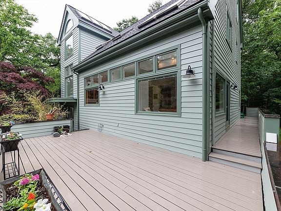 Impressive, custom built contemporary home on an expansive half acre+ wooded lot on tree lined street in Chestnut Hill. Designed by Harvard architect Mollie Moran includes sweeping 10 ft. cathedral ceilings & window walls overlooking lush park like multi level landscape. Elegant living room with marble wood burning fireplace accented with a wall of built-ins & a stunning entertainment sized dining room. Spacious, eat-in kitchen with built in window seat looks out onto private front deck. Adjoins a comfortable family room with wood burning stove & exits through triple patio door to another private deck. Second level includes two bedrooms, a bath & multiple closets with laundry. Also a king size en-suite primary bedroom & an additional office or media room that could easily be used as a bedroom. The third floor suite is perfect for teen or au pair. This is a one of a kind property! 2018 roof, high efficiency HVAC system & more. This is a must see.