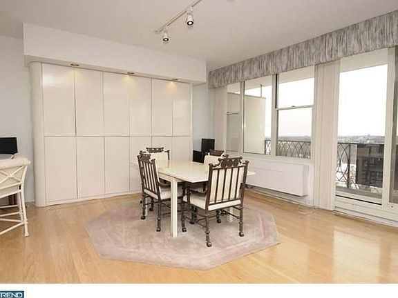 Lovely sun-filled top floor unit at Sutton Terrace facing the pool. The entrance area has a large closet. The spacious Living & Dining Room combination features windows & French door to a Balcony overlooking Philadelphia~s distinctive skyline. The eat-in Kitchen is functional with ample cabinetry, Corian counter space & rounded counter seating. The Laundry is located near the kitchen area. The Hallway has a spacious linen closet & storage closet. The ceramic tiled hall Bathroom has a stall shower & vanity sink with Corian top. The guest Bedroom is inviting, & can be used as a study. The Main Bedroom has a dressing area with custom closet storage. The Main Bathroom has neutral tile & double vanity sinks. Welcome to Sutton Terrace, a luxury building with a recently renovated lobby & 24-hour doorman, outdoor pool, exercise & library. Capital contribution fee 2 month~s condo fee. Move-in fee of $2500. Each owner pays separate fees for electricity use. The summer swimming pool membership is $100.