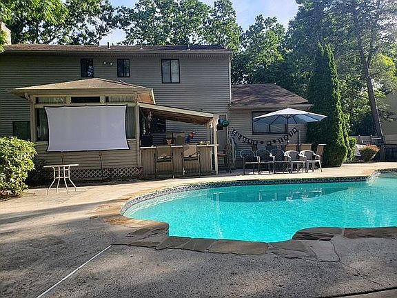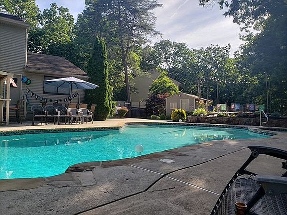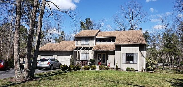 4 BR. 2.5 BA. home in desirable Medford. Very private wooded setting in lake community with beach and playground, 2 car garage with work bench, paved driveway. Sylvan pool, outdoor bar, pool house, storage shed, fenced yard. Major systems newer, updated kitchen cabinets and pantry with granite counters and tile back splash, stainless steel appliances, ceramic tile floors, some new laminate floors. Renovated main bath, newer: HVAC, well pump, pool pump. Sun room, vaulted ceilings in LR/BR/Hall, hardwood in LR and FR, fireplace, front patio, rear deck. Step into equity making some cosmetic upgrades.