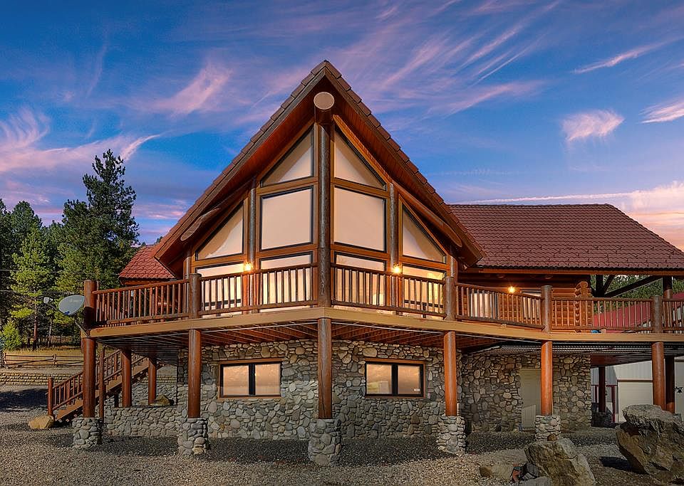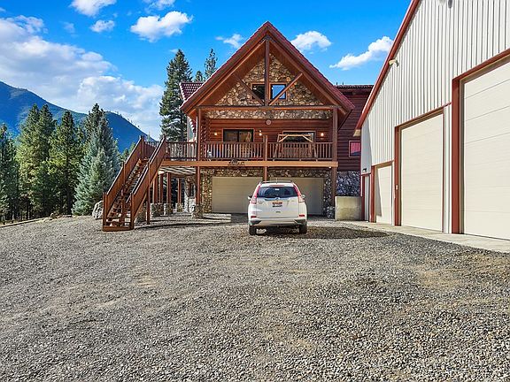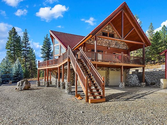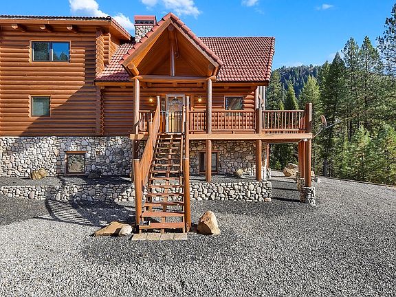 Spectacular log home located on a sprawling 39 acres of beautiful forestry with splendid views sweeping in every direction! The welcoming great room features floor to ceiling two story windows and a massive river rock fireplace to cozy up to when the weather gets cold. You'll love the open kitchen that has been recently updated with quartz countertops and a gourmet Viking commercial range and hood. Designed with two primary suites this home has lots of living space. The main-level primary suit has vaulted ceilings, private access to the deck, walk-in closet with custom built-ins and an ensuite with dual vanities and a soaker jetted tub. Outside the home is a full-length wooden deck to enjoy your peaceful surroundings. Large detached 36X50 shop has two RV bays with hookups included.