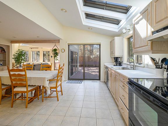 This house nestled within Great Woods provides options and has neat features like easy access to the bike trail and the National Seashore. Take the winding footpath from your backyard to the bike trail or go further and end up at the bluff overlooking the ocean. The spacious living room has soaring ceilings, radiant heat in the flooring and a wood burning fireplace. It opens into the large eat in kitchen and also out onto the sizeable backyard deck. Skylights enhance the natural light in this room and throughout the house opening the space up even more. You will find three bedrooms, including one on the first floor, two full baths and a finished basement in the main house. Bring your creativity for how to use the large finished room in the basement which also has a half bath. The fourth bedroom and third full bath are above the detached two car garage with their own entrance. There is plenty of room to spread out inside and out. Enjoy the central A/C, central vac, outdoor shower and large deck area.