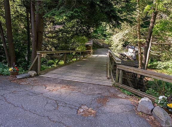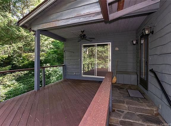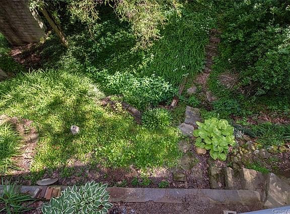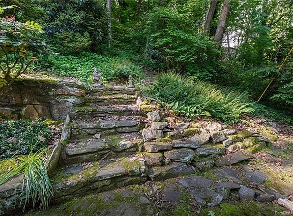 Rare opportunity to own in Asheville's historic Albemarle Park! Treehouse setting and natural stone hardscaping lend a magical feel to this unique one-level home. Drive across the wooden bridge to your urban retreat nestled into a hillside, lush with greenery and rustic stone steps and walkways. Add your personal touches to transform this home into a charming woodland cottage or mid-century oasis. Rustic wood-burning stone fireplace and original wormy chestnut paneling in a living room that looks out on the spacious deck and stream below. Hardwood floors in bedrooms and under the living room carpet. Kitchen was updated with stainless fridge, year-old Bosch dishwasher, and solid wood Kraftmaid cabinetry. Split bedroom plan has primary suite on one side and guest bedrooms and bath on the other. This home needs work but the potential is here to create your own unique retreat in Albemarle Park! For more info about this historic neighborhood go to albemarlepark.org.
