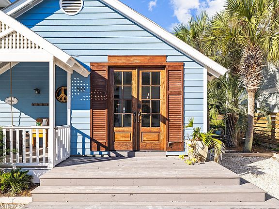 UNDER CONTRACT, ACCEPTING BACK UP OFFERS. Welcome to ''Little Blue'' on famous Grayton Beach! Filled with charm, this characterful beach cottage is nicely updated and comes with its own private yard oasis. Beach fans, and savvy investors, will love the LOCATION just one back from the white sand and emerald waters of Grayton Beach. Laid out on one level, the cottage is surrounded by shady palms and has its own private parking pads at the front and side. Steps lead up to the front porch which tempts you to pause awhile and enjoy the alluring gulf and lake views from the cushioned swing seat. Double doors with shutters lead inside to the open sitting room with hardwood flooring. The soaring vaulted ceiling adds light and space to the laid-back ambience with shafts of sunlight pouring in through windows and French doors. Four stools are lined up at the bar ready for brunch or cocktails, depending on the hour. The surprisingly spacious eat-in kitchen is well-equipped with white cabinets, stainless appliances and generous countertop space. Doors lead off to two cozy bedrooms, a modern bathroom and a half bath. Head outdoors through the rear porch, passing a stackable washer/dryer on the way. The delightful rear yard has a shady deck for alfresco living and dining in your own peaceful oasis. Large pavers create a footpath through the low-maintenance landscaping to the grilling area and outdoor shower. After dark, gather around the fire pit with family and friends, socializing and toasting marshmallows in the glowing embers. More than just a beach retreat, this is a place for memory-making in a highly sought-after location. It's within strolling distance of the popular Red Bar, restaurants and shops. The cottage is in a prime area for vacation rentals and could be replaced with a new construction home in the future. It comes with a neighborhood pool shared with a handful of neighbors as the cherry on top.