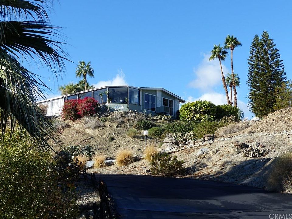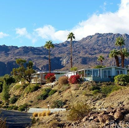 Attention all Snowbirds!!! Best Location in the park.This fabulous home,was custom built for this lot in 1977, it is also turned parallel with the road giving you much desired privacy along the entire back side of the home. Sliding glass doors on the backside of the unit,each room opens onto the 230 degree unobstructed view from 2 glass enclosed sun rooms, a deck that gives this home 300 sq. ft. additional living space and incredible views of the mountains, valley below and up Highway 74. Comfortable, completely turnkey & no property taxes.This 1440 sq ft home has 2 huge bedrooms and 2 full baths. Large kitchen and living space.Located in an excellent spot near clubhouse and pool. The perfect home or second home to enjoy the warm winters in the sunny warm desert community. This Family park community has a pool, 2 spas, a clubhouse, library and fitness center. 2 miles to El Paseo for shopping & award winning restaurants, yet peace and quiet on the hill. Walking & hiking paths abound. Elegant Big Horn is to the South and East. RV section for storage, laundry rooms and pet area as well.There isn't a place in this valley you can rent or own for the cost of the monthly pad rent that will afford you the serenity, amenities and size of this home. Excellent maintenance on this mobile. AC and composition roof and wood siding to keep your home cool in summer and warm in winter. An extra murphy bed for guests and carport for parking. You have got to see it to believe it!