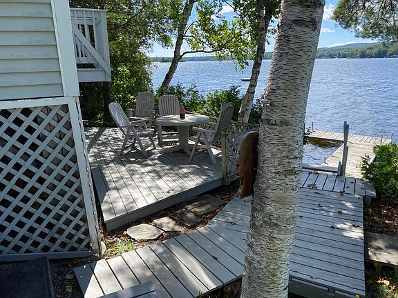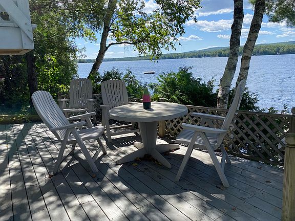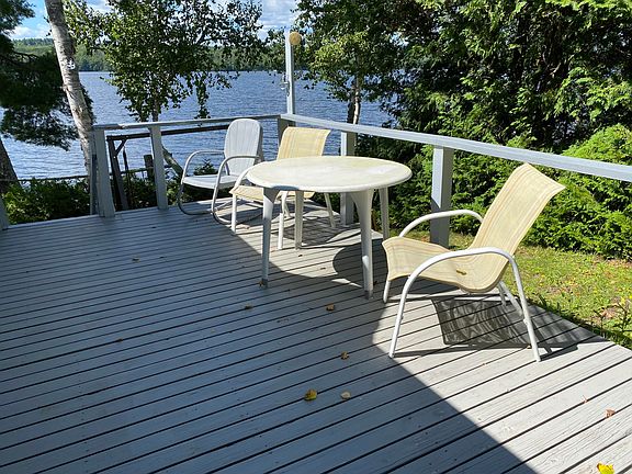 Relax in this comfortable camp on the waters edge. Enjoy watching the loons on the water, or toasting marshmallows over the firepit while sitting on one of the several decks. The camp is covered with maintenance free vinyl siding and a New Roof in 2021. It comes complete with docks, furniture, and appliances. The kitchen has a unique antique electric stove which will be the center of conversation. The floorplans opens to a front porch for sitting inside during cooler weather.