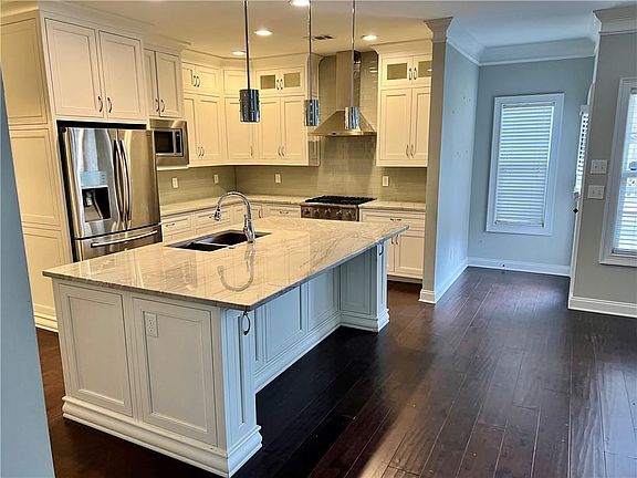 BEAUTIFUL high end remodeled home. The kitchen is stunning; custom white cabinets to the ceiling (inserts & soft close), Quartz countertops, large island with large sink, Viking gas range, SS fridge & dishwasher. There is glass tiled backsplash, SS hood, recessed lights and 3 hanging pendant light fixtures and plenty of storage. There is a breakfast nook to the side of the kitchen. The 3 sided brick home has a whole house water filtration system built-in. The dinning room is large and has a butlers pantry. Large windows bring in natural light throughout. The entire house has hardwood floors, heated tile floors in the upstairs bathrooms; remodeled. There are 4 large bedrooms upstairs; master has a sitting room. The master bathroom is very luxurious with a walk-in tiled shower and glass doors, custom cabinets, double vanity and his and her closets. The family room is spacious with book shelves on either side of the fireplace along with cabinets; there is a gas fireplace. There are beautiful wood trims throughout. A separate laundry room off the 2 car garage. The upstairs AC unit has been replaced recently. The house has been painted inside; last year the exterior trims were painted. The backyard has 3 sides fenced from neighboring properties and very private; the lot is level. Gated community. It's a beautiful home inside and out, a MUST see. It's close to Suwanee Town Center, shopping, restaurants and has excellent sought after school district.