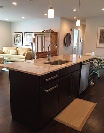 Highly desirable luxury building in Needham Center. Enjoy all the shops and restaurants right out your front door! This exquisite apartment has an open concept floor plan for easy living and fabulous entertaining. The kitchen has granite counters, stainless appliances, gas stove, European white lacquer cabinetry with large bar area which can be used for casual dining. There's also a dining space for a table. Large L/R with glass door leading to a private balcony. Also off the L/R is a super den/office. The master suite has a walk-in closet, king sized bedroom w/ceiling fan and bathroom with glass enclosed shower. Guest bath is Carrara marble with deep tub. Second bedroom has large closet and great windows. Deep hardwood floors throughout. Top shelf finishes. Central A/C. Large walk-in storage space in basement. Elevator building.Security system. Includes parking for one car. Canine or Feline family member welcome. See attached floor plan.