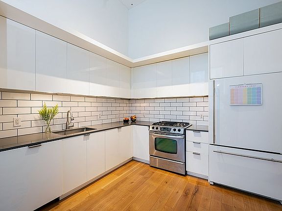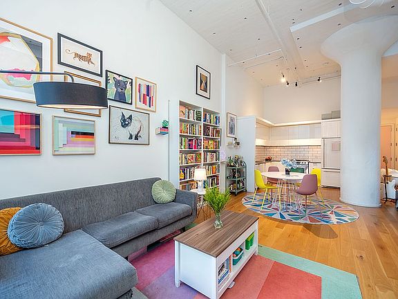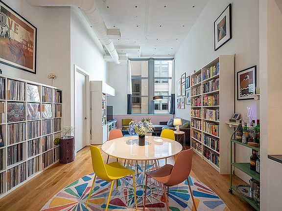 Located in the full-service Canco Lofts, this spacious and bright Southeast facing condominium boasts 1,021 sf of living space including one bedroom plus den and two full bathrooms. This voluminous loft with 14 ft ceilings and 11 ft windows and Central AC begins with a lovely entry way and flows beautifully into its open view from the kitchen overlooking the dining area and living room. The minimalist kitchen is simple and sleek with subway tile backsplash, concealed refrigerator and dishwasher, deep sink with garbage disposal and plenty of spacious cabinets. The primary bedroom has a generous closet and en-suite bathroom with walk-in shower. The den had made the perfect nursery, but would also make a great office or second bedroom. The massive guest bathroom with bathtub is also where a full-sized washer and dryer is located. Built in the 1920s, this former American Can Company was converted in 2008 with much desired conveniences and 10,000 sf of amenities including 24 hour doorman, shuttle service to PATH Monday-Friday, common recreation lounge with pool tables and catering kitchen, office space with high-speed WiFi, basketball court, screening room, over the top 4,000 sf fitness center with yoga room, sundeck, dog park & spa, children’s play room, rental parking in building and access to outdoor swimming pool nearby with additional fee. 17 years remaining on tax abatement.