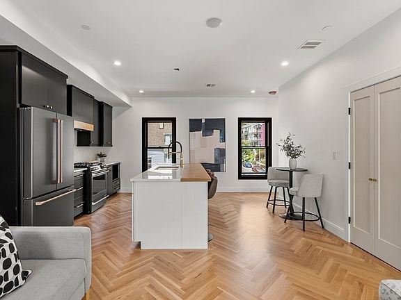 Amazing new units by Bay City Developments. Cutting edge design, with earthy modern finishes. This unit offers open floor plan with hardwood floors through out. Large eat in kitchen complete with center island, quartz and oak counter, top of the line black stainless steel GE appliances, Bronze plumbing fixtures 1/2 bath and separate wine storage area complete with temp control wine fridge and live edge shelving . Large primary suite with custom closets and full bath. Smart features include Sonos surround sound, smart thermostat and visual intercom system for each level. Large decks off living room, parking and pet friendly. There is a beautiful park over looking the city skyline for your dog to run around and building is close to public transportation and 93 North and South. 2 units left.
