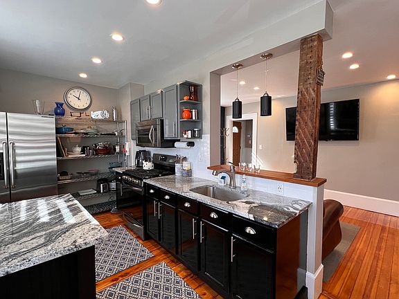 Built in year 1832, formally the Frost High School and Waltham's Town Hall. This fully furnished SMART urban townhouse has lots of exposed detail and original plank hardwood floors. The first floor has a modern kitchen, open layout, a large bedroom with cathedral ceilings and a king size bed, also the first floor bath features a 4-ft wide shower. On the second floor you'll find a large bedroom with a queen bed. Parallel to that, the suite, comes with a king size power adjustable bed, laundry room and master bathroom. The first floor lighting is controlled by Alexa or the wall switches. There are four 65 inch smart TVs with cable and high-speed Wi-Fi included. The living room has an Alexa with a Sonos speaker. The front door lock is digital. The kitchen is equipped with everything you would need, including a percolator coffee pot and Keurig. The refrigerator has an icemaker and filter system. Also, there is a Ninja blender, crockpot, cast iron Dutch oven, Electric rice maker, dishwasher and garbage disposal. The kitchen stove is gas and has a microwave above the range. The laundry room is equipped with a steamer and an iron. Located close to public transportation, major highways, shops and restaurants. Second washer and dryer in private basement. Includes 3 off street parking spaces and patio area. No Smoking. Don't miss this rare find!! BROKER FEE Martha Z RE No smoking. Snow removal included 2 washers and 2 dryers included Basic cable, internet included in this smart home.