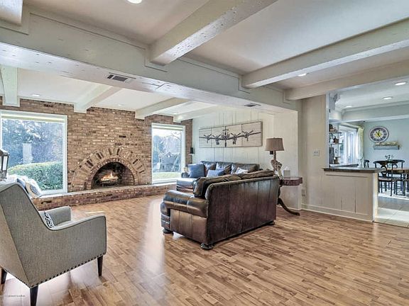 - RoomFamilyRoomFeatures: Fireplace - Woodburning, Floor - Laminate, Ceilings - Beamed, Dec Molding