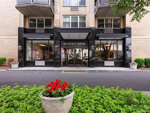 Desirable Soundview Towers offers this Manhattan style condo with SE exposure. Entry foyer opens to living room/dining area with sliders to private balcony. Formal dining room currently being used as office. Gourmet kitchen boasts s/s appliances including 5 burner convection range, granite counters & travertine floor. Fabulous closet space throughout. Common charges include: Pool, gym, sauna, concierge, heat, hot water, cooking gas & storage. Laundry on each floor. Garage parking space #38. Superb location; Walk to vibrant downtown shops, restaurants & theaters. Move in ready!