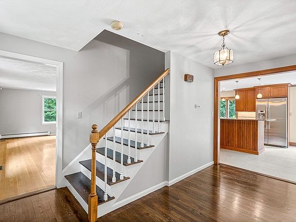 Spacious Colonial set in a country setting located on a very private 2 acre lot behind a beautiful stone wall. Eat-in kitchen has been updated with cherry cabinets, ceramic flooring, large center island with granite counters and some stainless steel appliances and pendant lighting. Kitchen is open to a spacious family room with cathedral beamed ceiling, wood burning fireplace, skylight and access to a large deck overlooking a private yard and in ground pool. Dining room with chair rail is located off the kitchen. Front facing formal living room. The rest of the first floor has hardwood flooring. Upstairs all bedrooms have dark rich hardwood floors that have recently been refinished. Master bedroom has two closets and private 3/4 bath. Finished lower level playroom with plenty of closet space. Circular driveway. Two car garage. Central air. Enjoy Stiles Pond, Smolak Farms and a great school system.