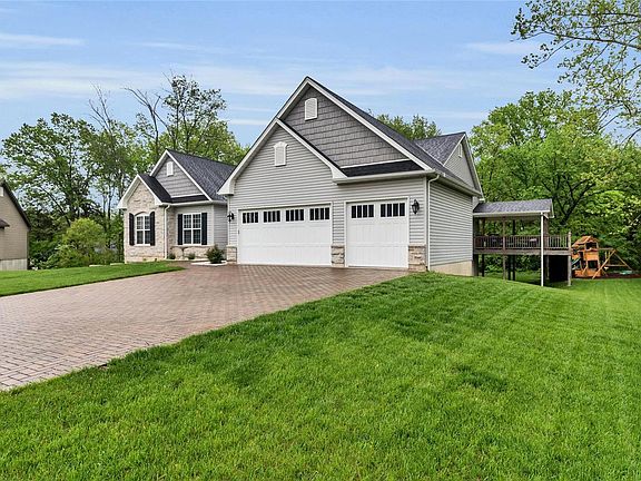 NEW PRICE! What a great opportunity to own newer construction in the Award-Winning Rockwood School District! On a quiet cul-de-sac court awaits this stunning ranch home, conveniently located near major HWY's and area attractions. The wow factor starts with an upgraded paver stone driveway and continues in with soaring vaulted ceilings. Buyers will love the light-filled, open floor plan! The great room boasts built-ins and gas fireplace with stone surround. Entertain with ease! The designer finished kitchen features a full complement of stainless appliances and center island with breakfast bar. Retreat to the master bedroom to find a huge en-suite bathroom and walk-in closet. A full bath, 2 more bedrooms, and powder room complete the main floor. The finished walk-out LL offers another true bedroom, convenient ½ bath, and recreational space with an amazing media room! An in-ground sprinkler system, security system, partially covered deck and 3-car garage round out the package!