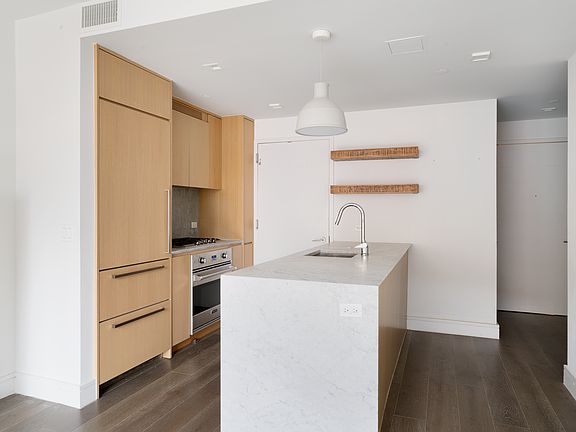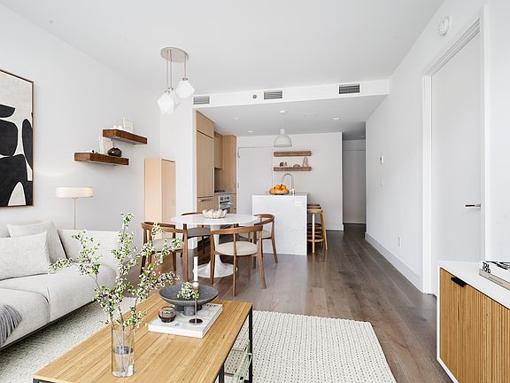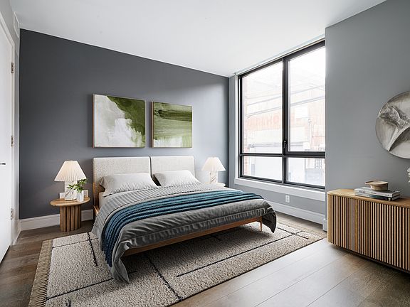 **New Construction 1-Bedroom with Home Office on Greenpoint's Riverfront** Offered for rent is spacious and modern 1-bedroom plus bonus room at the 50 Greenpoint condominium, located at the corner of Greenpoint Avenue and West Street. The apartment features modern conveniences, including central A/C & heat, in-unit washer/dryer, a modern kitchen with a suite of paneled appliances, and oversized double glazed windows soaking in western light. An arrival/foyer area with a large coat closet sits opposite a home office space, divided from the rest of the apartment by a sliding Shoji style sliding door. The main living and dining space is in conversation with an open kitchen with spacious peninsula, providing plenty of prep space. Large windows spanning the width of the room face out onto the historic streetscape of West Street. The large bedroom, also with a large windows facing west, has layout flexibility and a large walk-in closet, outfitted with a custom built-in storage. A modern bathroom with tub is very functional and sleek, including plenty of vanity storage. Through the kitchen, the apartment also contains a large utility closet which houses the washer & dryer, hot water heater, and extra storage space. The 50 Greenpoint Avenue condominium, built in 2017, enjoys a full suite of amenities for only 43 units. Amenities include a part-time doorman, ButterflyMX video intercom system after hours, roof deck, spacious residents' lounge, package room, gym, bike storage, additional laundry, and pet spa. The building is located nearby to the G-train at Greenpoint Avenue, along with NYC Ferry service at the India Street Pier. A truly overwhelming amount of bars, restaurants, and bakeries are at the doorstep of this well-located condominium. An on-site parking space may be available upon request for an additional charge. Please inquire. PLEASE NOTE: THIS APARTMENT HAS BEEN VIRTUALLY STAGED.