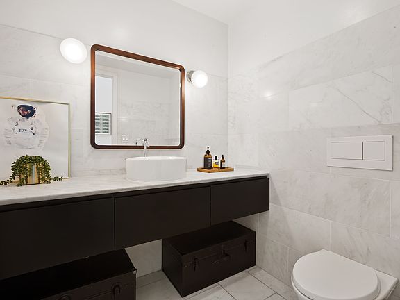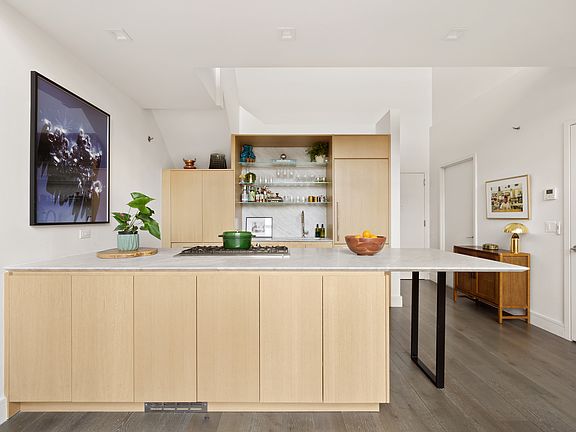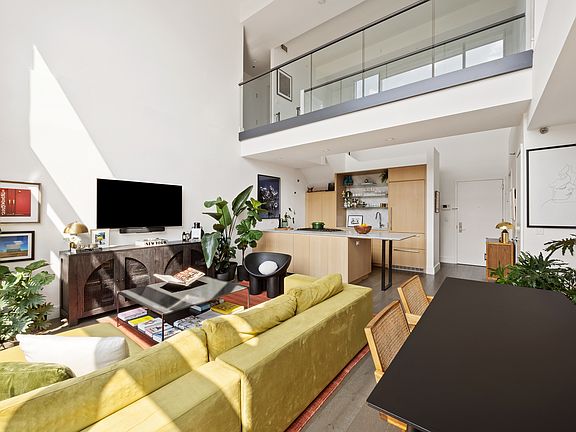 This exquisite and unique duplex two bedroom, two and a half bathroom home features soaring double-height ceilings, West facing windows with stunning city views and top of the line finishes in a brand new, fully amenitized boutique condominium. The floor-to-ceiling, energy efficient windows allow light to flood through the open, flexible living space, highlighting beautiful 7-inch white oak flooring and quality craftsmanship. The massive, double height living room window is equipped with a state-of-the-art electronic privacy shade. The custom kitchen features an extended Statuary Marble slab island with a Bertazzoni cooktop and oven, extensive milled oak cabinetry, a Bosch dishwasher, and Liebherr refrigerator.The unique, glass partitioned catwalk upstairs separates the two en-suite bedrooms. Each bedroom is graciously proportioned with extensive closet space and luxurious en-suite bathrooms with Hansgrohe polished chrome hardware and custom medicine cabinets.At a discreet seven-stories, with just 44 residences, 50 Greenpoint is a boutique, tastefully designed condominium in an unparalleled location. The building amenities include a double-height attended lobby, a serene lounge with fireplace, a playroom, a fitness center, and a landscaped roof deck with dining and sprawling city views. Ideally located on the edge of the East River waterfront, a stone's throw from Greenpoint's best restaurants and boutiques, and just two blocks from the G train and three blocks from the East River Ferry.
