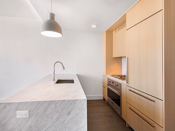 Live in Greenpoint's newest and hottest boutique condo 50 Greenpoint! Unit 4E is a spacious and bright 1Br featuring high ceilings and a wall of over-sized casement windows with partial city views. The modern minimalist inspired kitchen features Viking, Bosch and Liebherr appliances, marble counters and oak cabinetry. Designer finishes accent the bath with a mix of marble and tile, deep soaking tub, Hansgrohe hardware and floating wall mount toilet. Additional highlights include in-unit Bosch washer and dryer, 7 inch brushed oak flooring and individually controlled heating/cooling. 50 Greenpoint is a boutique 44 unit condo featuring a roof deck with stunning city and river views complete with bbq grill stations and areas for lounging and dining. There's also a resident lounge, fitness center, bike room and attended lobby. Discover the beauty and charm of Greenpoint, Brooklyn. Shopping, dining and transportation options all nearby. Brokers CYOF. No pets please. Unfurnished. No short term. Available for early July move-ins.