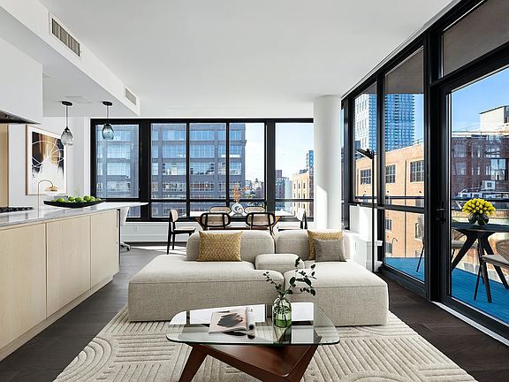 Your stylish kitchen features milled oak cabinetry, a statuary marble island countertop, Bertazzoni cooktop and oven, a paneled Bosch dishwasher, Liebherr refrigerator and a wine cooler. It is perfectly laid out to provide an optimal entertaining space and a separate dining area that can easily accommodate a large table for 6 or 8 guests. Your large primary en-suite bedroom has ample closet space and looks out to the Manhattan skyline through oversized windows. It provides enough space for a king-sized bed and a home office. The full bathroom offers contemporary luxury with a custom vanity and an elegant shower. The second and third bedrooms are generously-sized as well, tucked away from the living room to provide privacy and quiet and both of them enjoy fantastic light and view. The second bathroom offers marble tiles, soaking-tub and additional storage.