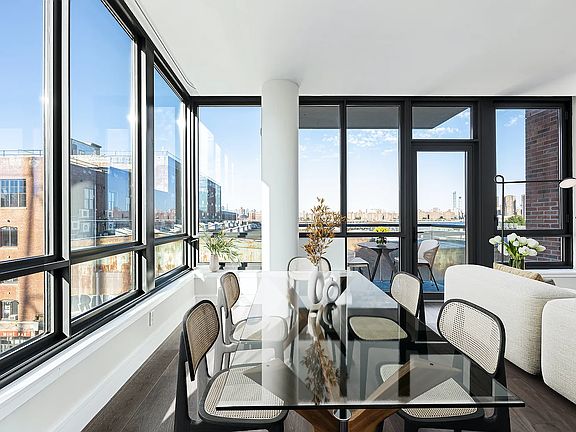 Residence 5H at 50 Greenpoint Condominium is an incredible, sun-drenched, three-bedroom / two-bathroom home. This corner apartment provides breathtaking views of the Manhattan skyline, parks and the East River through floor-to-ceiling windows and from a private balcony. A deeded parking space is also available for sale.