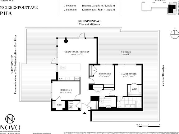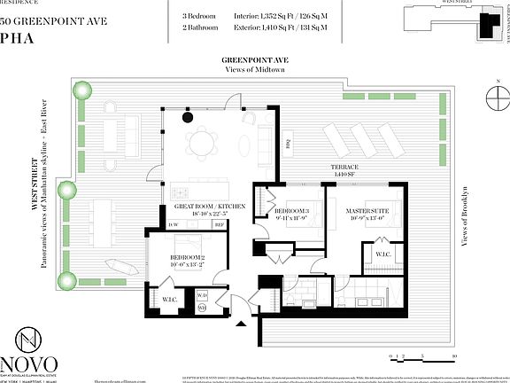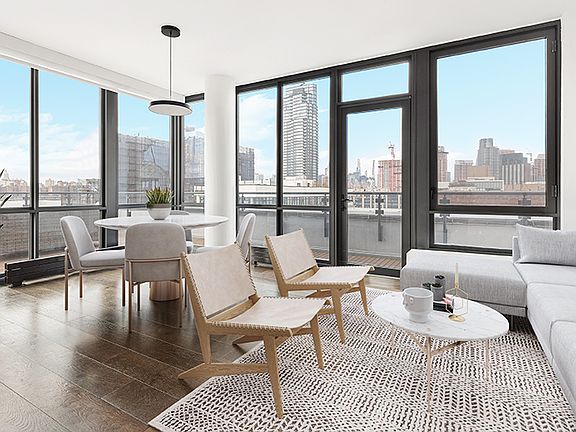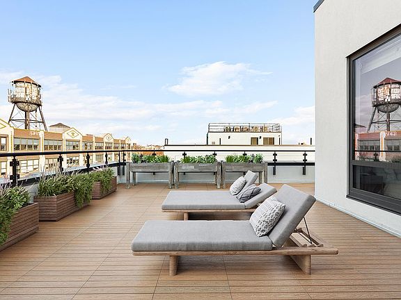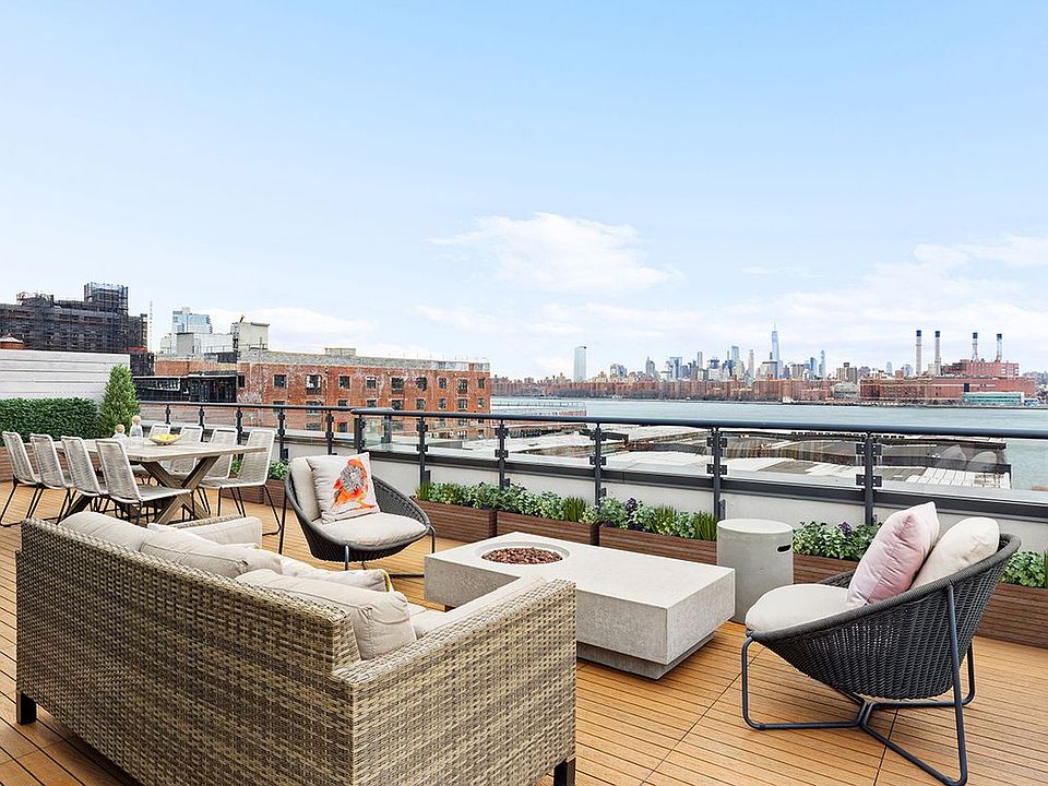 *3-Bedroom 2 Bath Penthouse with Wraparound Terrace* A luxurious, corner three-bedroom penthouse spans the entire North-Western corner of the building, with a 1,410 square foot wraparound terrace overlooking the East River, Manhattan, and Greenpoint. Floor-to-ceiling glass walls and doors integrate the indoors with the outdoors. The unit features premium finishes and quality craftsmanship, 7-inch brushed oak flooring, energy-efficient windows, exceptional sound insulation, central heating, and a cooling system. LED lighting with Lutron Maestro dimmers, motorized roman, and solar shades, custom walnut built-ins, and closets, wall-mounted Sonos speakers, plus Bosch washer and dryer in the home. Complementing the living and dining areas is a luxurious custom-designed open kitchen, featuring precision milled Oak cabinetry with concealed pulls and ample storage. The kitchen island spans ten feet long, with a custom waterfall Caesarstone countertop, offering breakfast bar seating for four. Top tier appliances include a custom paneled Viking refrigerator, Viking cooktop, and oven, including an integrated Bosch dishwasher. Observe the sunrise on the East from the primary bedroom, and relish panoramic sunsets on the East River's West deck. The expansive terrace wraps around all sides of the home, with picturesque views of the East River, Manhattan Skyline and Greenpoint, and various entertaining areas. The terraces are surfaced with maintenance-free, teak finish Newtechwood and includes raised self-irrigating planters, where you can plant your herbs and greens. The primary bathroom features floor-to-ceiling porcelain walls and floor tiles, a walk-in rain shower for two with an etched glass shower enclosure. The double wall-mounted vanity has a Nero Marquina countertop and an oversized mirror with a built-in medicine cabinet. The secondary bathroom has a medley of statuary white stone floor and ceramic wall tiles, radiant heated floors, along with an elegant built-in custom-crafted vanity and medicine cabinet with integrated lighting. Hansgrohe and Rohl fixtures and fittings are employed throughout. **Unit currently configured as two bedrooms with family room and will be switched back to its original 3 bedroom floor plan. *Parking and Storage is available in the building* *Case By Case and No Shares* - 50 Greenpoint is a seven-story, 44 unit boutique building, conveniently located by the Greenpoint waterfront, across from Transmitter Park, surrounded by local restaurants and shops. Commuters have access to the India Street Ferry, the G train at Greenpoint Avenue, and a short drive to the LIE. Surrounded by segregated bike lanes, it's only a block away from Citi Bike station on Milton Street. - Building amenities include a double-height attended lobby, residents lounge with fireplace, children's playroom, fitness center with two Peleton bikes, bike room, and landscaped roof deck.