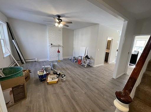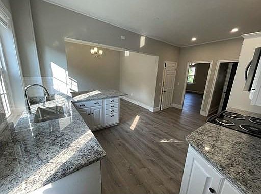 Beautifully renovated 3 bedroom/2 bath townhouse style apartment in a centrally located brick building. Main level features brand new kitchen with stainless appliances, white cabinetry, granite countertops. Open to dining area that has additional cabinetry and peninsula for plenty of seating. Spacious living room leads to enclosed and private front porch. First floor bath includes stackable washer and dryer. Vinyl plank flooring for easy cleaning. Second level has 3 good sized carpeted bedrooms, each with closet and ceiling fan, plus a second full bath. Freshly painted and ready for occupancy March 1st. Full basement for private and secure additional storage. 2 off-street parking spaces. Trash removal included. Economical natural gas heat and hot water. Sorry, NO pets.