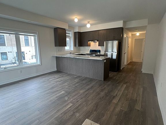 Open conceptLaminate floorsWalkout to a balconyBig picture windowModern kitchenStainless steel appliancesBreakfast bar