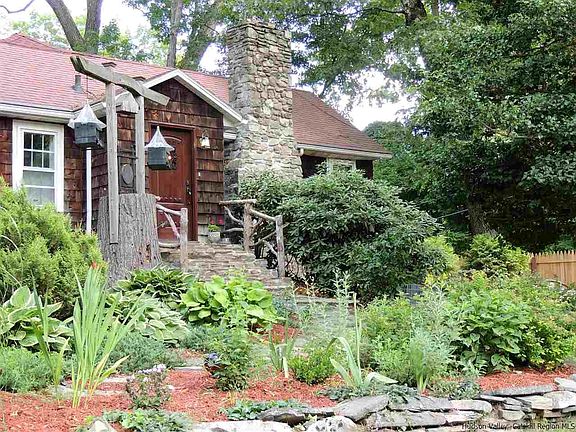 Located in the remote forests between St. Remy and Ulster Park, this charmed country cottage has been remodeled as a custom retreat on a quiet country lane. The forest in back of house gives plenty of room to roam around in your own private sanctuary. Large open kitchen with cathedral ceiling and skylites is fully equipped and offers the gourmet an excellent work space on soapstone counters, Herebeau fixtures and sinks, Sub-zero refrigerator, Blue Star range/oven with six burners and large custom hood. The adjacent butler's pantry has additional soapstone counters with additional appliances to help prepare for your parties. Nearby is a comfortable Vermont Castings woodstove. The living room with its is comfortable with stone fireplace, built in book cases in knotty pine walls, and beamed ceiling. This room was historically an apple storage barn last century. Large private master bedroom has a solarium for growing exotic plants, a custom bathroom with jacuzzi type tub surrounded by soapstone, and additional built in shower. A screened in deck is accessed off of the bedrooms and offers spacious and peaceful views of the forest in back. Downstairs is a large finished basement which is divided in three areas, workshop, office, den and has a French patio door to the back yard. The yard is extensively landscaped with perennials and is fenced in completely to keep out deer. The four fireplaces are in the living room, guest bedroom, den, and a woodstove is in the kitchen.