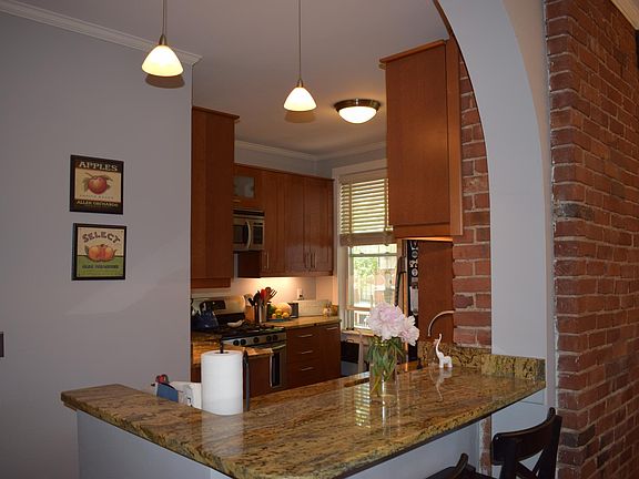 No broker fee. Property address is 50 Harvard Street, Unit 1, Charlestown, MA 02129. 2 bedroom, 1 bath with roof deck, loaded with detail and history in ideal Charlestown location. This unit has wide pine hardwoods throughout the open layout. Kitchen is renovated with custom cabinetry, and stainless steel appliances. Gas cooking and breakfast bar in kitchen as well. The living/dining space has 5 windows covering 2 exposures, exposed brick and a fireplace. Original civil war era built in lockers/china cabinets compliment the historical brownstone unit. Incredible common roof deck up the back stairs from kitchen with dedicated laundry and large storage area in basement. Street parking readily available. Owner pays for water. Renter pays for heat, gas, cable and electric. One month's rent plus security deposit due at signing. No smoking and no pets.