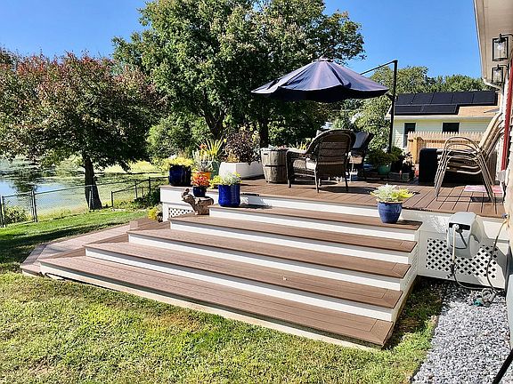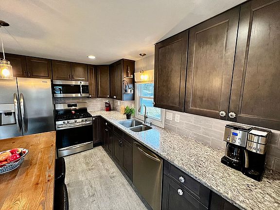 You will fall in love with this newly renovated waterfront ranch. Slip out of the sliding glass door to step onto the spacious, multilevel Trex deck overlooking Harris Brook pond. The deck was custom built to perfectly fit a hot tub and multiple levels designed for entertaining, overflowing flower pots, and much more. Enter your home through the side door and you’ll cross the spacious stamped concrete patio perfect for grilling, entertaining over the peaceful sights of the pond, or watching little friends delight on the play area. The side door steps into your newly renovated eat-in kitchen featuring granite countertops and stainless steel appliances including a refrigerator, dishwasher, built in microwave, and gas range. The cabinets feature a raised panel design with a deep blue stain to create a traditional yet eye catching look. Home chefs will delight over the five-burner gas stove. This three-bedroom home was recently renovated into a two-bedroom to create a bright and sunny living space overlooking Harris Brook pond. Large sliding glass doors attached to the main living room peer out over the pond where you’ll spot families of ducks, beaver, birds, and so much more throughout the season. Open the screen for a fresh breeze to fill your home or step out onto the Trex deck to enjoy your morning coffee over the sights. The main living space includes two bedrooms, a dining room, living room, bathroom and kitchen. All rooms feature new flooring, new baseboards, and new doors. The renovations create an open, clean, and modern feel. The remodeled bathroom features a tile tub surround and a granite counter top. Walk downstairs to the open basement which features plentiful storage with a washer/dryer and a cedar closet. The new pellet stove will quickly heat up the spacious area. The multi-use space is well suited for several functional areas. Today it is set up to feature a gym, living room, office, and card table! The fully fenced in yard makes this home ideal for pets and small friends. The fence provides gated access to Harris Brook for fishing or kayaking throughout the season. Two sheds provide spacious outdoor storage for all your seasonal equipment to enjoy the beautiful waterfront property. This home is located in a quiet cul-de-sac neighborhood convenient to the mass pike and 291.