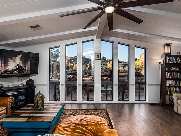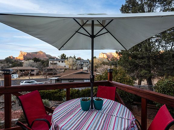 Secluded Sedona location for this hilltop home perched for unblockable red rock views. This efficient home is in immaculate condition, complete with recent designer touches and is in move-in ready condition. Elevated location offers direct red rock views from the living room, modern kitchen, and endless views from the sun deck - perfect for morning coffee or a sunset cocktail after a day of exploring the nearby National Forest trails. Located in the Village of Oak Creek far from a busy road, this pocket of homes offers privacy and seclusion - while being just minutes from grocery stores, restaurants and trail access.