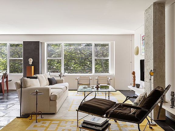 Enter the home through the mahogany-paneled door, where southern light and treetop views complement the exquisite black Indian limestone floors, which are found throughout the home. Large art walls and the open layout belie the typical scale of a two-bedroom home, creating ample room for lounging, entertaining, cooking and dining. Accents, such as a raw concrete column and floating shelves, add texture and dimension.