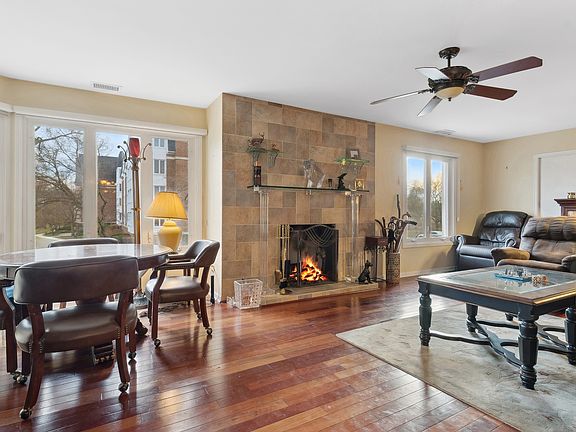 Enjoy maintenance free living in this spacious, sun drenched 2-BR plus den condo in the sought-after Cambridge on The Lake. This first floor unit offers an abundance of natural light with panoramic views of the lake. As you enter you are greeted by an expansive center foyer that leads to a generous living room with double windows framing the tranquil lake views. The gas start fireplace with a marble surround and Brazilian cherry floors create a cozy ambiance, perfect for unwinding or entertaining. The adjoining dining room, illuminated by a lovely chandelier, provides a seamless flow for gatherings. A beautifully updated eat-in kitchen features ample cabinets, stainless appliances, granite counters w/ custom backsplash, a pantry closet and a tucked-away stackable washer and dryer, ensuring convenience and practicality. A double door to a large den connects it to the living room and offers a versatile space that's perfect as a home office, additional bedroom or a cozy TV room. The primary suite is a retreat in itself, boasting cherry floors, a walk-in closet plus a reach-in closet, and a full bath complete with a tub/shower. Generously sized 2nd bedroom and the den share a 2nd full size bathroom with a walk-in tub. Additional highlights include two storage lockers conveniently located on the same floor and a parking space (2nd from the elevator) in a heated garage, a bike room and additional laundry facility in the building. The complex offers wonderful amenities that include a clubhouse with an indoor swimming pool, sundeck, exercise facilities, billiard room, large meeting/ party room with fireplace, catering kitchen and a lovely walking path around the lake. New roof in 2023. Assessments include heat, water, garbage, snow removal, landscaping and clubhouse. This condo's prime location ensures easy access to shopping, dining, and entertainment, catering to your every need.
