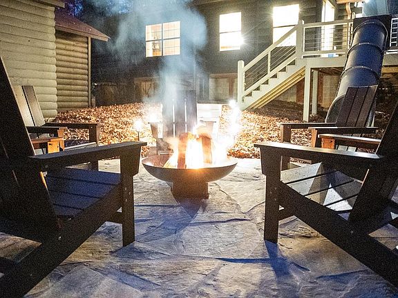 Cozy fireplaceFull dining roomWell equipped kitchenSurrounded by serene woodlandsSpacious single level layoutBoth fire pitsBuilt in slide
