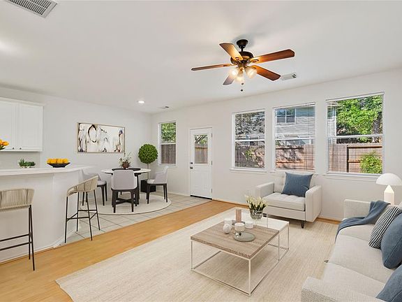 Lovely 3 Bedroom, 2.5 bath townhome located in the Heart of the Woodlands. Open floor plan. Natural lighting throughout. Two-story foyer. Kitchen is open to living room & breakfast area. Walk-in pantry. Spacious primary bedroom with walk in closet. Primary bath with double sinks, soaker tub & separate shower. Secondary bedrooms with walk in closets. Low maintenance laminate wood flooring downstairs & upstairs. NO CARPET anywhere. Upstairs loft area.Great for work or play area. Nice size backyard with wood deck. Full sprinkler system.Two car garage. Washer, Dryer & Refrigerator included.Upgrades -Freshly painted interior 2022, Cedar fence 2021, Stainless dishwasher 2020, AC/Furnace 2015, Wood Deck 2014,Sprinkler system 2014,Laminate floor stairs and upstairs 2013.HOA replaced roof 2015 & painted exterior 2021.Move-in Ready.Conveniently located to restaurants and shopping. Walking distance to Coulson Tough & TWHS 9th grade.Home is virtually staged to illustrate arrangement of decor.